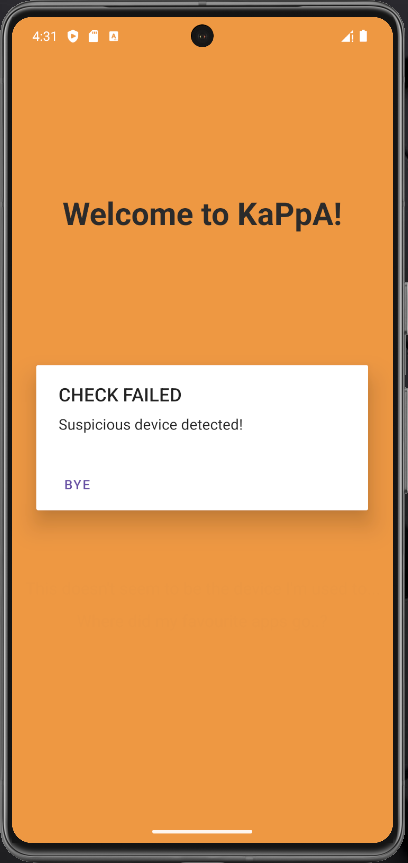 If the above are successful, we can install the modified APK in the Android emulator and run the app again. This time, a blank orange screen shows up. There seems to be another check that we are failing.