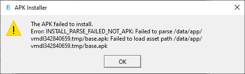 However, in the case of kpa.apk, the comment field has a value of 0xa, yet the file ends immediately after it. Starting an Android emulator from Android Studio, if we tried to install kpa.apk directly, an error is shown: