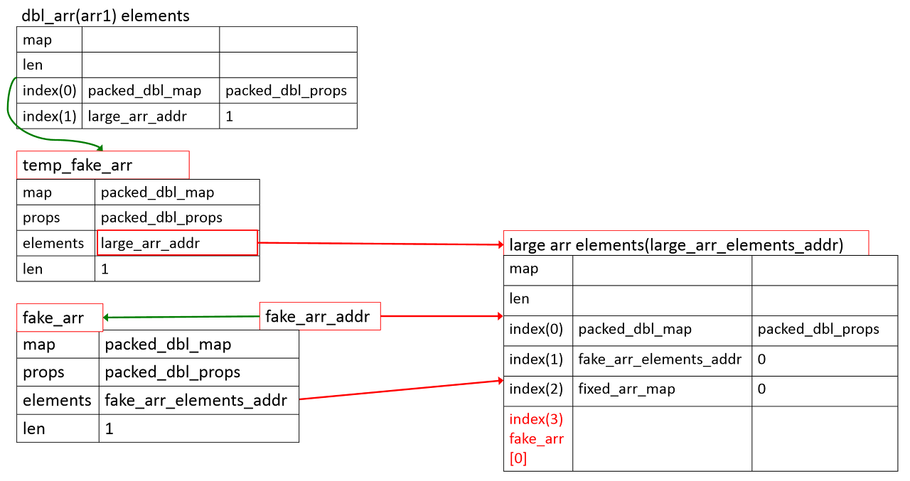 Using the internal pointers, we construct a series of fake objects inside the elements structures of our existing arrays, summarised in the following diagram from the article: